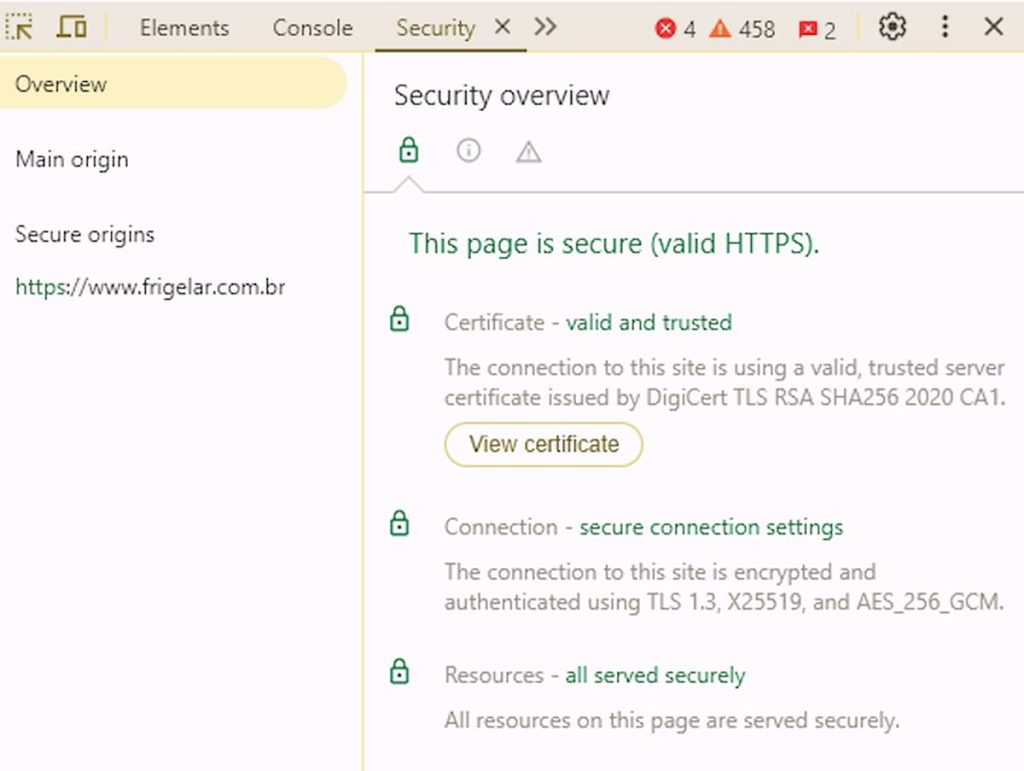 Você pode fazer essa conferência via Dev Tools. Basta clicar com o botão direito do mouse na página, clicar em inspecionar e ir em “Security”. Você deve encontrar as seguintes informações: