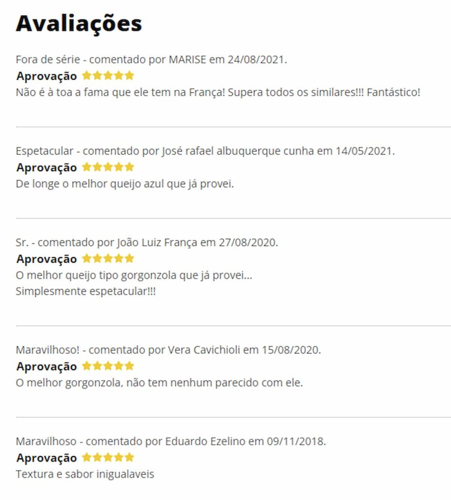 Exemplo de comentários em página de produto: https://www.bancadoramon.com.br/queijo-saint-agur